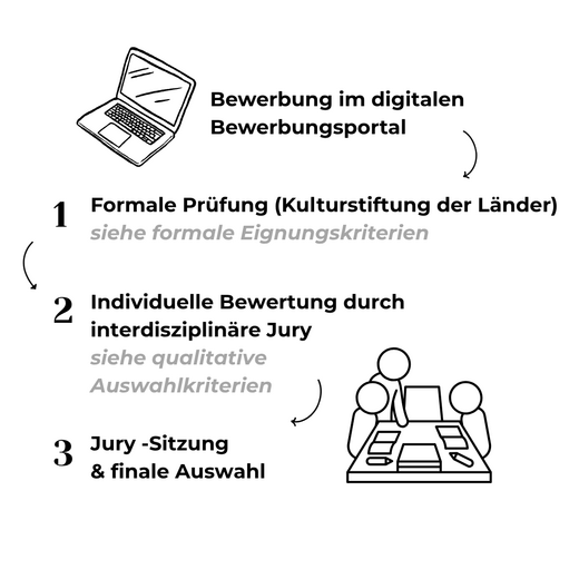 Nach Bewerbungsschluss wurden alle eingegangenen Bewerbungen durch das PRISMA Team formal auf Vollständigkeit und Förderfähigkeit im Sinne der Satzung der Kulturstiftung der Länder geprüft. Die Auswahl der ersten Kohorte erfolgte anschließend durch eine unabhängige, interdisziplinäre Jury und anhand von fünf qualitativen Auswahlkriterien.